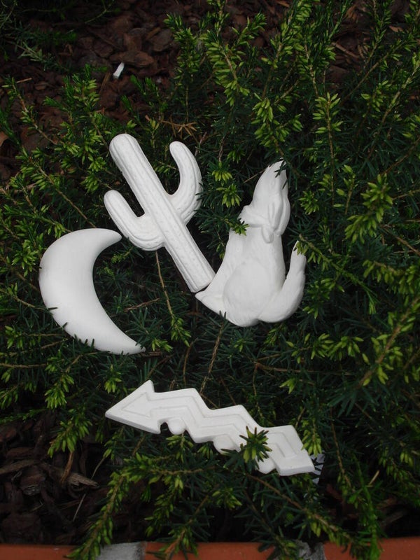 4 ornamenten: cactus, schicht, wolf, maanset van 4 stuksHoogte 7 cm - breedte 3 cm
