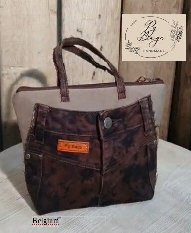 Deze handgemaakte handtas is een gedurfd modeaccessoire voor iedereen die houdt van een stoere en stijlvolle uitstraling. Gemaakt van gerecycled denim met een opvallende bruine dierenprint en een stevige canvas bovenkant, combineert deze tas duurzaamheid met een edgy look. De originele spijkerbroekdetails, zoals de zakken en knopen, geven de tas een speelse en authentieke touch. De compacte, maar ruime vorm maakt het een ideale tas voor dagelijks gebruik.
