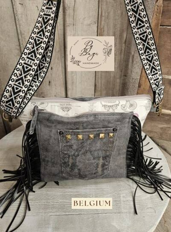 Geef je outfit een opvallende touch met deze handgemaakte crossbody tas, vervaardigd uit gerecycleerde jeans en afgewerkt met stoere details. Dankzij de combinatie van denim, kunstig afgewerkte franjes en een verstelbare boho-schouderband is dit een tas met karakter én comfort.