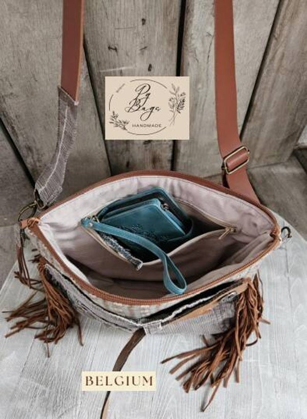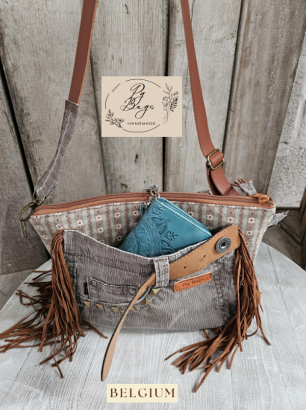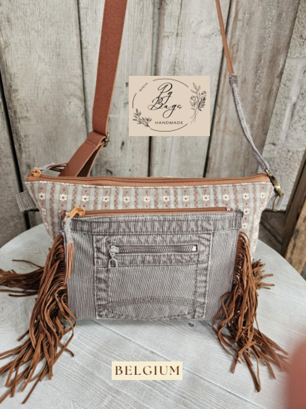 Een unieke crossbody tas, handgemaakt uit upcycled ribfluweel en afgewerkt met bohemian details. De combinatie van zachte bruine tinten, franjes en een leren riem zorgt voor een warme en stijlvolle uitstraling.