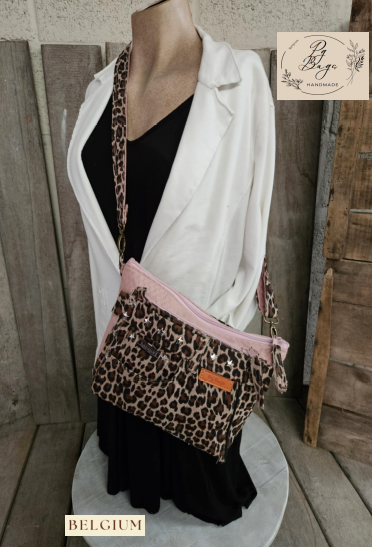 Trendy, handgemaakte crossbody in zacht roze met speelse leopard-print. Compact maar verrassend ruim, met veilige rits bovenaan, verstelbare schouderriem en extra vakken voor snelle spullen. Perfect voor elke dag: van citytrip tot avondje uit.