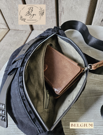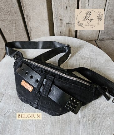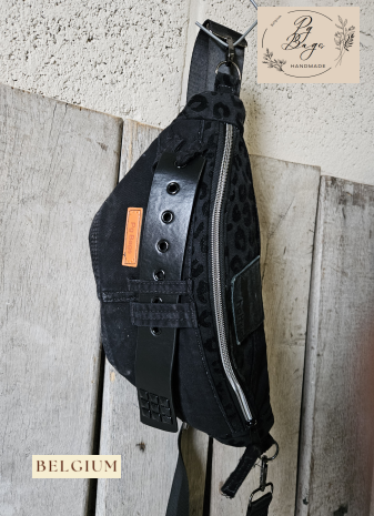 Stoere beltbag uit gerecycleerde zwarte jeans, gecombineerd met zwarte panterstof en een brede riem met metalen studs. Draagbaar als heuptas of crossbody, met een ruim hoofdvak dat volledig sluit met een rits. Handgemaakt in België – one-of-a-kind stuk.
