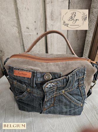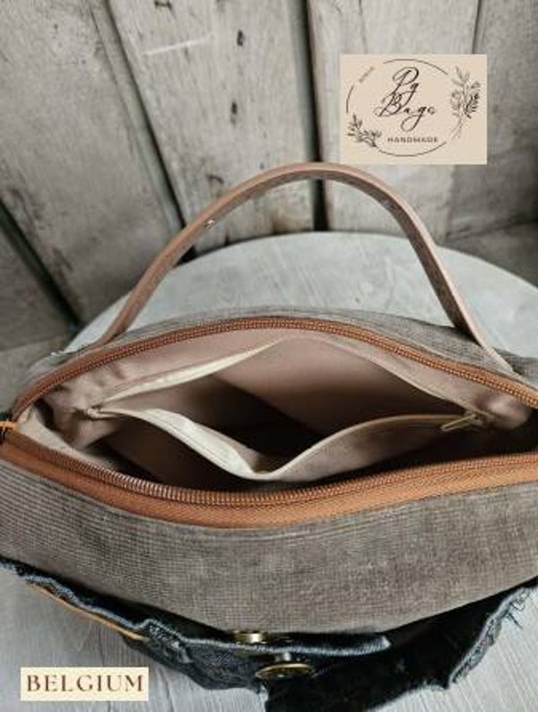 Unieke handgemaakte handtas uit gerecycleerde jeans, gecombineerd met stevige canvasstof en afgewerkt met een elegante handgreep in cognackleurig imitatieleder met subtiele studs. De originele jeanszakken aan de buitenzijde zorgen niet alleen voor een stoere look, maar ook voor extra praktische opbergruimte. Handgemaakt in België – elk stuk is volledig one-of-a-kind.